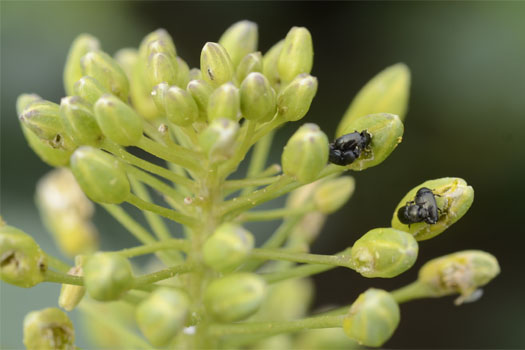 Abb. 2. Der Rapsglanzkäfer ernährt sich von Pollen. Um an den Pollen zu gelangen, muss er die Blütenknospen zerbeissen. Diese vertrocknen und fallen ab.