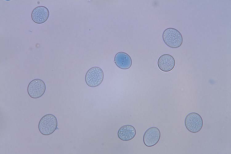 Der obligate Parasit H. parasitica bildet in der Wirtspflanze ein nicht septiertes Myzel und Haustorien (spezialisierte Hyphen, die der Nährstoffversorgung des Parasiten dienen). Die Sporangienträger (Abb. 3) wachsen einzeln oder in Gruppen durch die Spaltöffnungen und sind sechs- bis achtmal verzweigt (dichotom). An den Enden werden elliptische Sporangien (Konidien) gebildet (Abb. 3), die 12-22 x 24-21 µm gross sind (Rimmer et al. 2007). Während des Sexualstadiums werden Oogonien und Antheridien erzeugt, die entweder aus den gleichen oder aus verschiedenen Hyphen entstehen. Nachdem ein Antheridium ein Oogonium befruchtet hat, wird eine Oospore (Dauerspore) gebildet. Reife Oosporen sind dickwandig, gelbbraun und kugelförmig (26-45 µm).