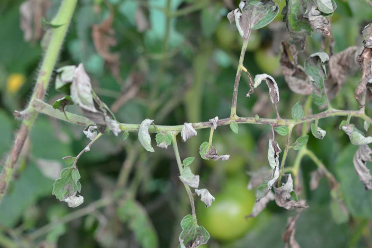 Die Kraut- und Braunfäule (Phytophthora infestans) kann eine ernsthafte Bedrohung für die Tomatenproduktion in Folientunneln und im Freiland sein. Besonders wenn die Tomaten bei kühlen Temperaturen, langen Regenperioden, hoher Luftfeuchtigkeit oder Taubildung angebaut werden. Die Kraut- und Braunfäule bei Tomaten geht in der Regel von befallenen Kartoffelbeständen aus. Sie verursacht braune Blattflecken und scharf begrenzte Flecken an den Stängeln und Blattstielen. Auf der Blattunterseite bildet sich ein grauweisser Pilzrasen, bestehend aus Sporangienträgern und Sporangien. Letztere können zu Neuinfektionen führen. Als vorbeugende Massnahme wird empfohlen, Tomaten nicht in der Nähe von Kartoffeln anzubauen, Tomaten mit einer Folie abzudecken und die Wetterseite abzuschliessen (empfohlen für die Haus- und Kleingärten) um die Blätter trocken zu halten.