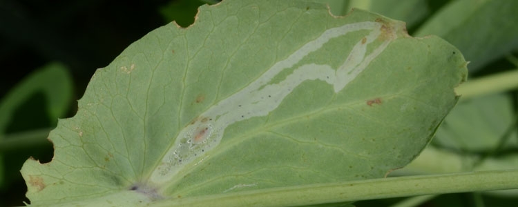Die Larven der Erbsenminierfliege fressen in den Erbsenblättern, ohne dabei die obere und untere Blattschicht zu verletzen. Es entstehen so genannte Gangminen, die von aussen gut sichtbar sind. Eine Bekämpfung ist in der Regel nicht notwendig.