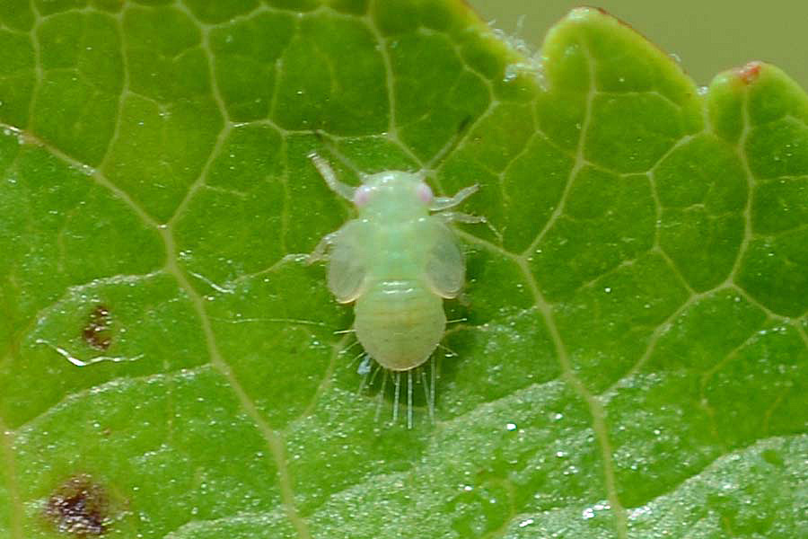 Die 1 bis 2 mm langen Larven sind sehr flach, breit und eiförmig. Die jungen Larven sind hellgelb bis grün, nach mehreren Häutungen braun und besitzen rote Augen. Ältere Larvenstadien haben auffällige Flügelknospen.
