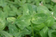 Rotklee: Die Blätter von befallenen Pflanzen sind deformiert und an der Basis angeschwollen. Das Gewebe ist hellgrün und sieht schwammig aus (Abb. 1 und 2). Im fortgeschrittenen Stadium der Krankheit sind die Stängel verdickt und gestaucht. Die ganze Pflanze zeigt Zwergwuchs (Abb. 2). Der Wurzelhals ist oft angeschwollen.