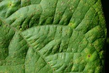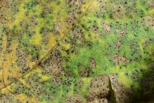 Abb. 1. Bohnenrost (Uromyces appendiculatus): Blattoberseite und -unterseite mit Uredolagern (Bild oben und Mitte), rotbraune Uredo- und schwarze Teleutolager (unten)